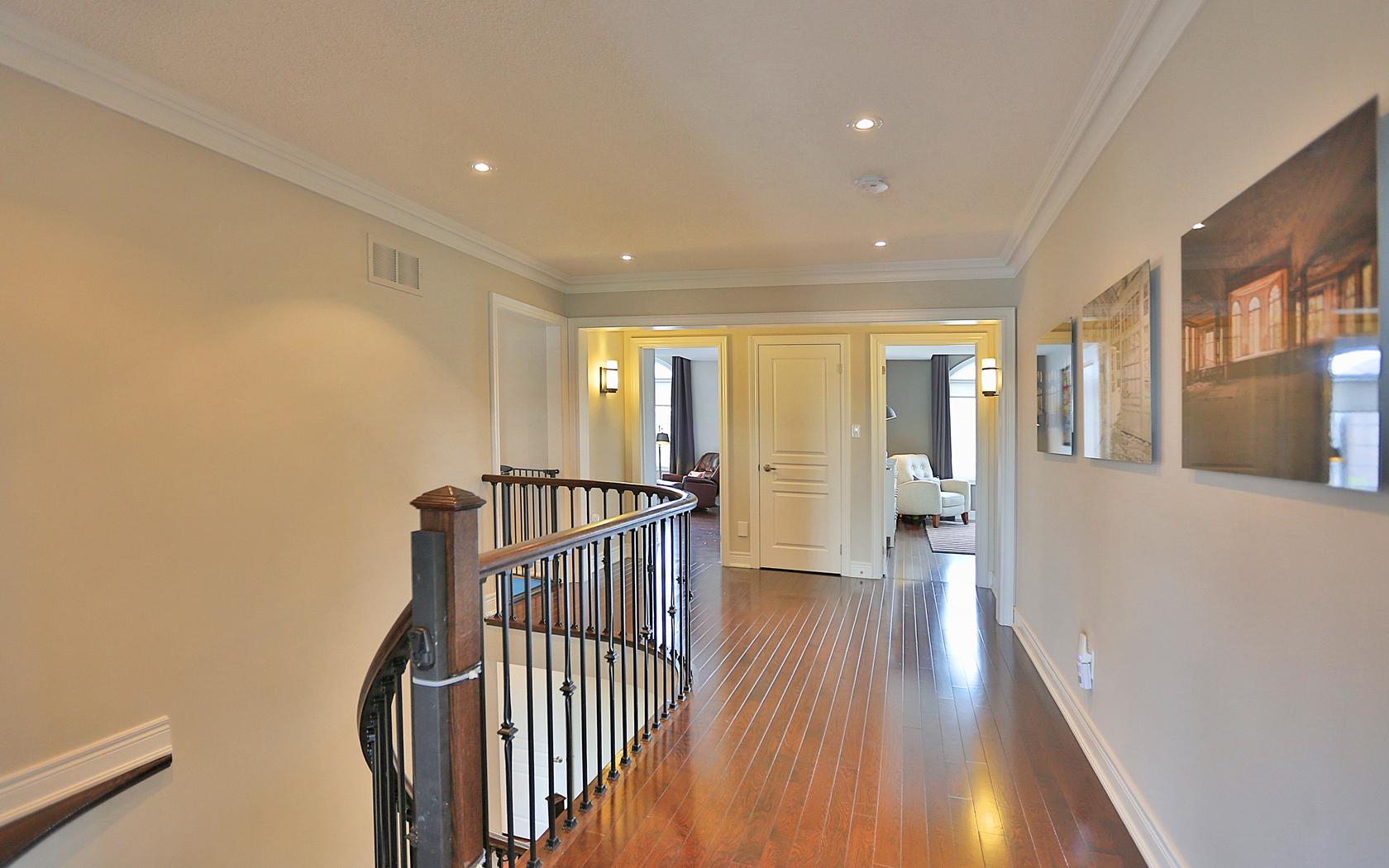 A open winding oak staircase with wrought-iron pickets leads upstairs to the bedroom level. The 2nd floor is also covered in dark-stained hardwood, and features 4 well sized bedrooms, 3 of which feature ensuite bathrooms. The 2 front bedrooms are a great size and each come with a 4-piece ensuite bathroom, complete with ceasarstone counter-tops, porcelain tiles, mosaic trim and upgraded faucets. Furthermore, these two front facing bedrooms have beautiful decorative windows, oversized closets with organizers and blackout blinds with drapes.